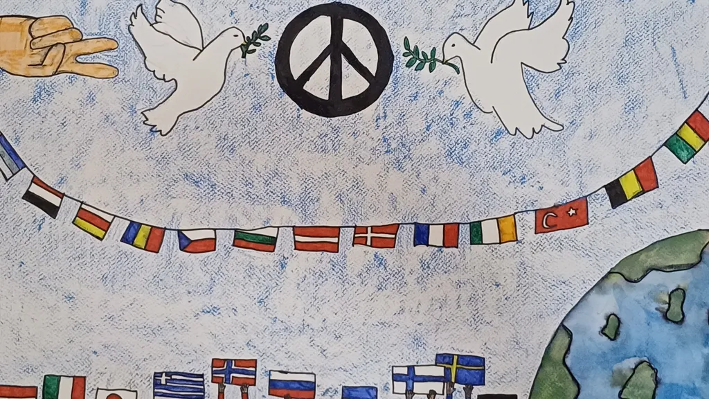 Näyttelyssä on esillä rauhanjulistekilpailuun osallistuneita töitä Lions 107 M-piirin (Satakunta) alueelta.