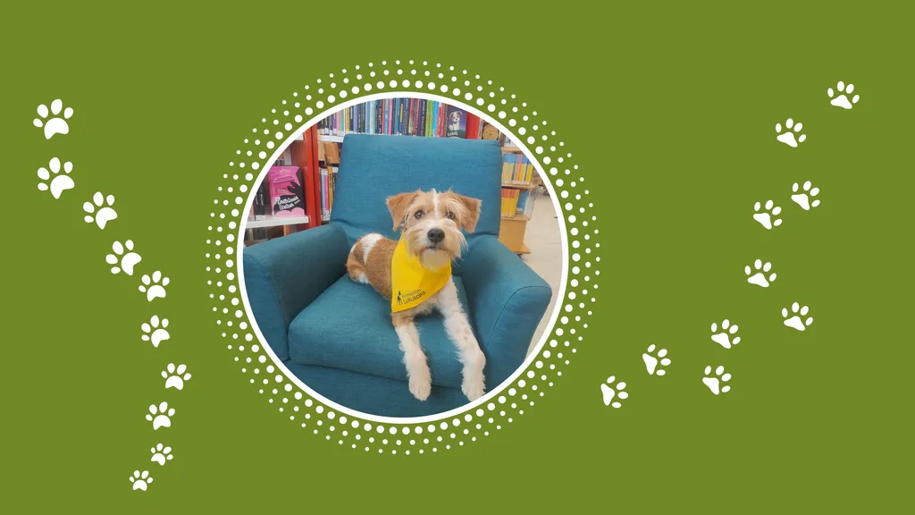 Lukukoira Roihu kuuntelee lukijan itse valitsemaa kirjaa rauhallisessa tilassa Noormarkun kirjastossa.