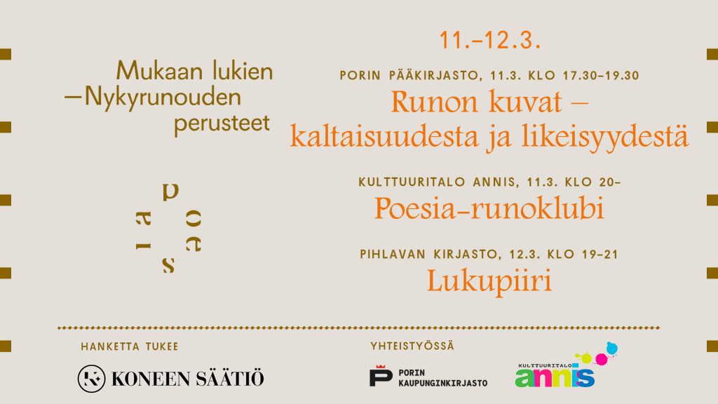 Poesian Mukaan lukien -keskustelusarja rantautuu Poriin 11.–12. maaliskuuta. Osuuskunta Poesian tuottama Mukaan lukien – Nykyrunouden perusteet -keskustelusarja kiertää vuosien 2025–2027 aikana ympäri Suomea. Sarja tekee tunnetuksi nykyrunoutta. Porissa neljä omaäänistä nykyrunoilijaa keskustelee runon kuvista ja kuvallisuudesta. Lisäksi luvassa on runoklubi ja lukupiiri.